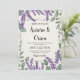 Célébrez votre histoire d'amour avec nos exquises Violet Lavender et Eucalyptus Wedding Invitations. Ces invitations magnifiquement conçues se marient harmonieusement dans d'élégantes teintes de violet et de lavande douce, accentuées par la verdure luxuriante des feuilles d'eucalyptus. La combinaison crée une esthétique sereine et sophistiquée, parfaite pour les couples à la recherche d'un thème romantique et d'inspiration nature. Conçu sur papier de qualité supérieure, chaque invitation est minutieusement détaillée pour assurer une présentation gracieuse qui séduira vos invités. Que vous planifiez un rassemblement intime ou une grande fête, ces invitations donnent le ton pour une journée de mariage mémorable et enchanteresse. Personnalisez votre invitation avec vos détails uniques pour ajouter une touche personnelle à ce design époustouflant.