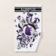 Cette amusante serviette de basket-ball pour son sac à engrenages comporte une "explosion" de balles de basket violet, noir et blanc de taille variée et des formes d'étoiles violet et gris sur un arrière - plan blanc - un motif de pois blancs minuscules couvre l'étoile violette - customiser avec le monogramme de l'athlète sur le plus grand basket-ball et nom sur bandes de varsité noire orientées verticalement - par katz_d_zynes