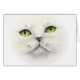 Un portrait étroit et mou d'un chat perse blanc aux yeux verts saisissants.