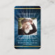Un ciel bleu foncé comme arrière - plan, un cadre faux or et l'espace pour votre photo. Poutres claires, derrière la photo. Personnalisez et ajoutez le nom, les dates, le texte et la prière.