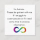 Cette carte est un moyen simple mais efficace de communiquer à d'autres que vous ou un proche êtes autiste et peut avoir besoin d'un soutien ou d'un hébergement supplémentaire. Le message est clair et facile à lire, ce qui en fait un excellent outil pour les personnes autistes à utiliser dans une variété de situations, de l'école ou du travail à des événements sociaux. C'est un moyen parfait de sensibiliser à l'autisme et de promouvoir la compréhension et l'inclusion.