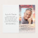 Nos petites cartes de prières commémoratives mesurent 2" x 3,5" lorsqu'elles sont pliées. Ce design a de l'espace pour une photo de votre bien-aimé sur le devant avec leur nom et leurs dates. A l'intérieur, vous pouvez ajouter une autre photo et un court verset ou une prière. Au fond, vous pouvez ajouter des mots de remerciement. Veuillez noter que cette carte ne peut pas être laminée. Nous avons une gamme de cartes de prières laminées à plat disponibles dans notre magasin.