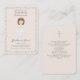 Communion Girl Praying Prayer Card Cette belle et douce Première Sainte Communion design d'une petite brunette priant paisiblement lors de sa journée spéciale est sur une pêche pâle et arrière - plan sage. Accentué par un cadre feuille fleur sauvage. Chérissez les grands souvenirs de la première communion sainte de votre enfant avec ce magnifique design. Consultez les accessoires, la papeterie et les cadeaux de communion de la Première Sainte Communion correspondants.