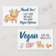 Avec leur vache super mignonne, ces cartes de visite sont la meilleure façon de remercier les restaurants ou les cafés qui servent de la nourriture végétalienne à base de plantes et de leur faire savoir combien vous l'appréciez. Le dos de la carte contient quatre beaux animaux de dessins animés (vache, cochon, lapin et coq), avec les mots Vegan for the Voiceless
