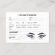 Adaptez vos détails de service et conservez vos dossiers clients organisés avec notre carte de dossier client. Conçue pour les entreprises de cils, cette carte vous permet d'élaborer une carte customisée "Lash Map" et d'inclure des notes essentielles. Assurer un registre des clients détaillé et bien organisé pour offrir un service personnalisé et efficace