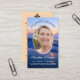 Thème de plage coucher de soleil avec votre photo préférée dans un cadre ovale. Le script et la typographie classique sont utilisés. Au dos de la carte se trouve la prière qui peut être customisée sur un arrière - plan jaune couché de soleil.