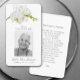 Orchidées blanches élégantes, une photo et les détails de votre célébration de la vie sur le front et la prière du Seigneur, ou toute prière, sur le dos, il suffit de taper votre libellé. Beau à inclure à un enterrement, service commémoratif, anniversaire de mort ou dans des notes de remerciement. CORRESPONDANCE d'objets dans notre collection.