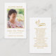 Dimensions cartes de visite : 3,54 po x 2,165 po Carte de script or pour prière funéraire simple. Personnalisez avec votre photo préférée, votre nom et votre date. Design on back of card est un élégant coeur de croix d'or et un message personnel qui peut être customisé pour répondre à vos besoins uniques.