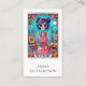 Un carte de visite d'art amusant et luxuriant dans un style de carte tarot, avec un squelette peint dans un studio d'art coloré.
