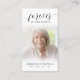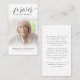 Funérailles Forever Hearts Carte de prière de script photo. Gardez la mémoire d'un être cher proche avec cette carte de prière personnalisée avec une photo chère, le titre FOREVER IN NOS COEURS, le nom et les dates et un message de souvenir chaleureux modifiable. Avec son design classique, simple mais élégant, noir et blanc et son script de calligraphie moderne et sophistiqué avec des swashes, il fait un souvenir significatif à partager à un enterrement, service commémoratif ou Célébration de la Vie et offre le confort et un hommage durable à la famille et aux amis. Sa petite taille portable de 3,5x2" (taille porte-monnaie) permet aux proches de la porter avec eux pour rappeler la vie et l’esprit de l’être aimé.