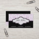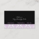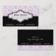 Carte de visite aux intérieurs damassés blancs violets noirs, avec un motif mauve lilas et blanc damassé. La partie inférieure est de couleur noire solide. Une bande noire et une bande violette séparent les deux parties. Votre entreprise/nom est tapé sur un élégant étiquette damassé aux contours noir et violet.