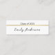 Le texte d'affichage du nom du diplômé apparaît dans un élégant script noir sur cette carte de nom de diplôme. Une ligne d'or fausse (pas de feuille) est au-dessus du nom. En haut, il y a du texte noir pour l'année de classe. Au dos, il y a quatre lignes de texte noir pour le nom du diplômé, le numéro de téléphone, l'adresse e-mail et la poignée des médias sociaux. Tout le texte peut être modifié ou supprimé.