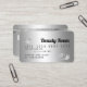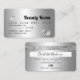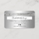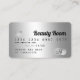Un élégant carte de visite moderne et élégant de style beauté Hair et maquillage artiste de type carte de crédit avec une typographie de police de script moderne sur un arrière - plan chic faux gris argenté glam tendance . tout le texte est personnalisable, ajoutez vos médias sociaux. Avec une fausse bande argentée. Ajoutez votre logo, votre monogramme et votre code QR.