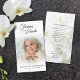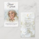 Photo funéraire Forever Hearts Cross God's Garden Poem Prayer Card. Gardez le souvenir d'un être aimé proche de cette carte de prière personnalisée avec une photo chère, le titre FOREVER IN OUR HEARTS accentué avec deux coeurs d'or, nom et dates sur le devant et une prière modifiable ou votre message de souvenir accentué d'une croix d'or avec un arrière - plan muet de fleurs blanches ou remplacer par votre propre photo ou image. L'échantillon montre le poème "Le jardin de Dieu". Avec son design classique simple mais élégant, noir et blanc accentué par la typographie de script or et calligraphie, il fait un souvenir significatif à partager à un enterrement, service commémoratif ou Célébration de la Vie et offre le confort et un hommage durable pour la famille et les amis. Sa petite taille portable de 3,5x2" (taille porte-monnaie) permet aux proches de la porter avec eux pour rappeler la vie et l’esprit de l’être aimé.
