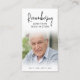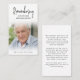 Photo funéraire moderne rappelant le nom carte de prière. Gardez la mémoire d'un être cher proche avec cette carte de prière personnalisée avec une photo chère, le titre NOM REMEBERING, les dates et un message de souvenir chaleureux modifiable. Avec son design simple classique noir et blanc et son écriture manuscrite moderne, il fait un souvenir significatif à partager à un enterrement, service commémoratif ou Célébration de la Vie et offre le confort et un hommage durable à la famille et aux amis. Sa petite taille portable de 3,5x2" (taille porte-monnaie) permet aux proches de la porter avec eux pour rappeler la vie et l’esprit de l’être aimé.