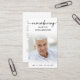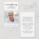 Photo Funéraire Simple Se Souvenant Du Nom Carte De Prière Moderne. Gardez la mémoire d'un être cher proche avec cette carte de prière personnalisée avec une photo chère, le titre NOM REMEBERING, les dates et un message de souvenir chaleureux modifiable. Avec son design simple classique noir et blanc et sa typographie moderne manuscrite swash, il fait un souvenir significatif à partager à un enterrement, service commémoratif ou Célébration de la Vie et offre le confort et un hommage durable à la famille et aux amis. Sa petite taille portable de 3,5x2" (taille porte-monnaie) permet aux proches de la porter avec eux pour rappeler la vie et l’esprit de l’être aimé.
