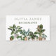 Un carte de visite horticole, adapté à une pépinière plante ou à une petite entreprise. Sur un arrière - plan blanc, le design botanique se compose d'images d'aquarelle de neuf plantes dont un ficus, la peperomie, l'aloe vera, la calathea, le pothos et l'oiseau du paradis. Personnalisez-vous en ajoutant vos coordonnées commerciales et de contact à l'avant et à l'arrière.
