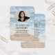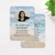 Belle aquarelle photo funérailles/mémorial/cartes de prière avec une photo au-dessus d'une vue pittoresque arrière - plan des vagues de l'océan roulant vers une plage de sable.