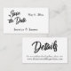 Gardez vos invités mariages dans la boucle avec tous vos plans, en utilisant ces cartes d'encarts pour mariage détaillées. Le design minimaliste comporte de jolis graphiques typographiques qui lisent "Save the Date" sur le devant et "Details" sur le dos, en utilisant une police de script élégante, moderne, gras écrit à la main. Utilisez les champs modèle pour ajouter tous vos propres détails afin de personnaliser ce design pour votre propre usage. Si vous souhaitez modifier la police serif polyvalente que j'ai utilisée pour le texte modifiable ou déplacer des lignes ailleurs, cliquez sur le lien pour customiser la carte plus loin. Tout type est en noir et a été placé sur un blanc modifiable ; vous pouvez changer cette couleur arrière - plan à tout ce que vous voulez. // 89 // Conçu par Melody Watson pour Paper Muserie.