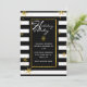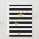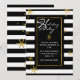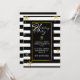 Invitation de vacances design et moderne faite dans un motif à rayures horizontales noir et blanc. Des graphiques de flocons de neige dorés ornent l'arrière - plan, et une zone de texte noir à bordure dorée a un texte blanc lisant Happy Holidays, dans un style typographique. Personnalisez le texte blanc pour votre fête de vacances. Des produits correspondants sont disponibles.