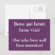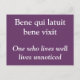 Une carte postale violette avec une phrase latine et sa traduction anglaise en dessous. "Celui qui vit bien vit sans être remarqué", par Ovide.