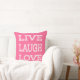 Les trois clés d'une vie heureuse....vivez chaque jour au maximum, riez beaucoup, et aimez sans condition. Ce charmant coussin de motivation comporte trois mots d'inspiration : Live, Laugh, and Love mis en valeur contre un arrière - plan rose vif contrastant.