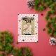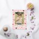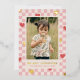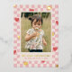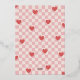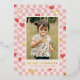 Une carte de la Saint-Valentin en feuille métallisée avec des cœurs rouges dispersés sur un motif à carreaux roses. Le message et les informations sur le client sont placés sous une grande photo, et le dos de la carte présente un motif coordonné.