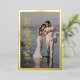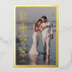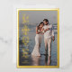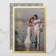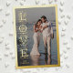 Cette carte de la Saint-Valentin avec impression feuille d'or présente un design élégant utilisant le mot Amour. Le message personnalisé est également imprimé en feuille d'or. La bordure décorative en gras et facultative encadre parfaitement une photo de famille adorée, tandis que la conception typographique verticale crée une mise en page intéressante et unique. Le verso de la carte présente un motif orné avec un fond de couleur personnalisé.