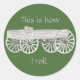 Ces amusants, voilà comment je roule, des autocollants, mettent en scène mon dessin d'un wagon rustique. Le wagon est tiré dans les tons gris et brun thé. Le texte est également écrit en gris et peut être customisé avec votre texte. L'arrière - plan affiché est vert et il peut également être customisé. Merci pour faire du shopping CherylsArt sur Zazzle.