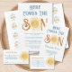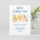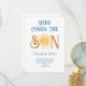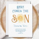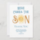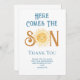 Le carte de remerciements de baby shower de ce mignon garçon comporte le texte "Here Comes The Son" en typographie rétro bleue avec un soleil d'aquarelle jaune souriant. Facile à personnaliser. Aquarelle originale © Michele Davies.