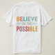 Le t-shirt comporte un message audacieux et stimulant : "Croyez en le possible". Le texte est rendu dans un schéma multicolore, avec chaque mot une teinte vibrante différente. Cela crée un design dynamique et inspirant qui attire l'attention.