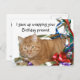 Frustré chat tabby orange enchevêtré dans des rubans carte postale d'anniversaire. Texte avant "J'ai arrêté d'emballer ton cadeau". Retourner le texte "Voici votre carte". Convient à tous les âges. Le texte peut être modifié ou supprimé avec le bouton PERSONNALISER