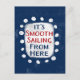 Le texte gras "Smooth Sailing From Here" est centré sur un arrière - plan bleu marine. Le texte rouge et bleu est posé sur un rectangle blanc avec de grands points blancs texturés autour, offrant un contraste ludique sur le fond de couleur solide.