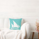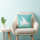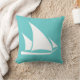 élément de décoration sur le thème de l'océan voilier blanc sur oreiller bleu sarcelle d'un côté et rayure sarcelle et blanche au dos.