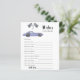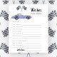 Carte d'invitation baby shower à thème de voiture de course avec des illustrations aquarelles d'une voiture vintage violet (violet) et drapeau noir - blanc. "Course pour un baby shower."