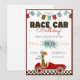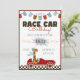 Conçu pour notre collection Race Car Birthday, cette carte d'invitation personnalisable comprend à damiers drapeaux, voiture rouge, girafes et polices décoratives. Éléments correspondants disponibles.