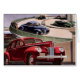 Illustration vintage de voyage et de transport avec plusieurs automobiles anciennes circulant sur la route ou l'autoroute. Véhicules familiaux à quatre portes, grands phares et calandres classiques.