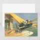Illustration vintage de style victorien représentant un voyage futuriste et un moyen de transport de science-fiction avec une voiture cabriolet volante équipée d'ailes. Le chauffeur est sur le point d'atterrir avec son véhicule futuriste (ou s'agit-il d'un avion ?) au magasin de vente de chocolat au détail dans le futur. Un design de science-fiction rétro classique de livre de bande dessinée.