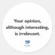 Une phrase préférée de Pragmatic Institute, cet autocollant vous aidera à mettre en valeur votre valeur pour la voix du marché sur les opinions internes. Votre opinion, bien qu'intéressante, n'est pas pertinente.