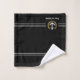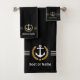 Personnalisez votre maison avec un élégant ensemble de serviettes de bain à thème nautique affichant votre nom de bateau, nom de famille ou autre texte désiré. Ce design personnalisé comprend une ancre de bateau vintage, des feuilles de laurier de style or avec emblème d'étoile et fini avec des bandes blanches délicates sur un arrière - plan noir royal. L'arrière de l'ensemble est blanc, tandis que vous pouvez facilement changer la couleur primaire avant pour correspondre à votre décoration ou à votre thème actuel.