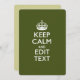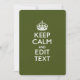 Votre Keep Calm dans un décor personnalisé de couleur vert olive. Un style personnalisé Keep Calm en disant sur un cadeau de nature. Essayez humour ou fantaisie sur vos mots créatifs sur deux lignes de texte modifiables. N'oubliez pas d'utiliser les lettres CAPITAL pour obtenir les meilleurs résultats. Utilisez le lien "Demandez à ce concepteur" pour nous contacter avec vos demandes de design spécial ou pour obtenir de l'aide sur vos besoins de personnalisation.