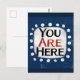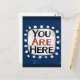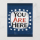 "You Are Here" est un design de texte mignon en bleu avec du texte en noir et rouge, avec une forme d'accent blanc et des points blancs à texture blanche.