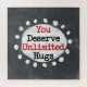Le texte gras "You Deserve Unlimited Hugs" est centré sur un arrière - plan gris. Le texte noir est posé sur un cercle blanc avec de grands points blancs texturés autour, offrant un contraste ludique sur le fond de couleur solide.