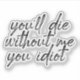Ajoutez une certaine attitude à votre jeu d'hydratation avec l'autocollant d'eau "You'll Die Without Me You Idiot" ! Ce rappel hilarant et audacieux vous fait siroter avec style et sobriété. Parfait pour les bouteilles d'eau, les ordinateurs portables ou n'importe où qui a besoin d'un peu d'humour et d'honnêteté !