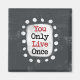 Le texte gras "You Only Live Once" est centré sur un arrière - plan gris. Le texte noir est posé sur un rectangle blanc avec de grands points blancs texturés autour, offrant un contraste ludique sur le fond de couleur solide.