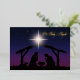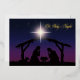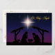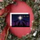 Cette belle carte de Noël de la Nativité a une vue nocturne de l'écurie et de la crèche avec le bébé Jésus et Marie et Joseph surplombant le Seigneur Jésus avec une étoile brillante au-dessus. Les mots "O Holy Night" sont faits en véritable feuille d'or dans le coin supérieur droit sur le côté avant. Le dos a un cadre de défilement en or SIMULÉ avec un libellé bleu marine personnalisable qui peut être changé pour dire ce que vous voulez.