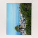 Puzzle. Une vue panoramique sur Honolulu Hawaii est présentée avec des immeubles hauts regroupés près du rivage. Un seul palmier trône au premier plan, au sommet d'une colline verdoyante surplombant la zone urbaine et l'océan bleu qui s'étend au-delà.