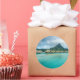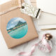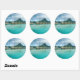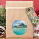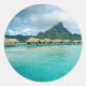Autocollant photo rond avec un luxueux complexe de bungalows sur toit de chaume surplombant l'eau dans une station de vacances dans le lagon bleu clair avec vue sur l'île tropicale de Bora Bora, près de Tahiti, en Polynésie française.