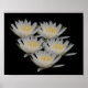 Pretty white water lily lotus flower blossoms on a black background design by Susan. Please visit Smilin' Eyes Treasures Posters to see more flower and nature photography images.