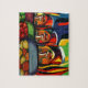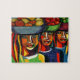 Ce puzzle artisanal présente une aquarelle représentant trois femmes africaines célébrant leur héritage culturel.
